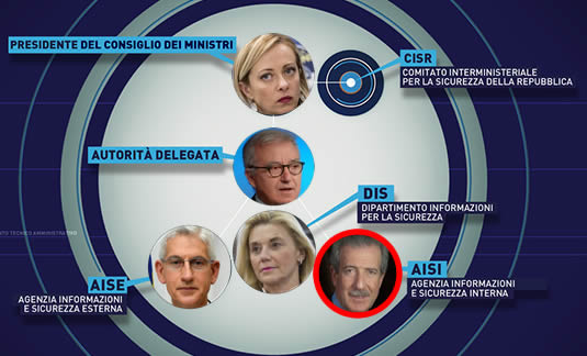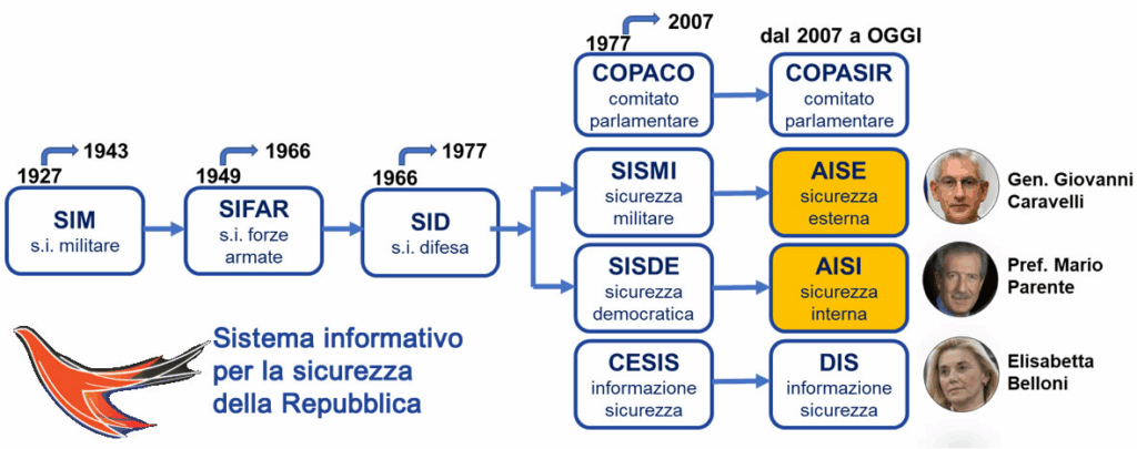 Ma partiamo dalla storia: Nel 1948 gli USA creano in diversi paesi europei l’organizzazione Nato Stay Behind, una struttura paramilitare clandestina col compito di contrastare un’eventuale invasione da parte dell’Unione Sovietica, che in Italia prenderà il nome di Gladio. Puntualizziamo che il primo Servizio di intelligence Italiana, di informazioni militare (Sim – attivo fino al 1945), venne istituito con regio decreto nel 1925 (un secolo fa, appunto), per unificare le strutture dei servizi segreti dell’esercito, marina e aeronautica e porre le basi per la costruzione di un sistema informativo unico coordinato a tutela della sicurezza dello stato. Nel 1949 nasce invece il Servizio Informazioni Forze Armate (SIFAR), nel 1966 il SIFAR viene riorganizzato nel SID (Servizio Informazioni Difesa), sciolto nel 1977 e sostituito da due strutture distinte: il SISMI (Servizio per le informazioni e la sicurezza militare) e il SISDE (Servizio per le informazioni e la sicurezza democratica). Nasce anche il CESIS (Comitato esecutivo per i servizi di informazione e sicurezza). Da ultimo la riforma del 2007 che istituisce il Sistema di Informazione per la sicurezza della repubblica e la nascita del Dipartimento delle informazioni per la sicurezza (DIS), con funzioni di coordinamento, e delle Agenzie AISE (per la sicurezza esterna) e AISI (per la sicurezza interna) per assicurare un ‘sistema civile’, coordinato e trasparente in cui dovrebbero proteggere gli interessi del Paese nel rispetto dei valori costituzionali (es: Meloni fascista cattolica integralista anticostituzionale…). Invece la storia ci racconta che i politici, sia di destra che di sinistra, si sono venduti ai più ricchi e ai più forti militarmente, secondo i propri interessi politici ed economici, leccando sempre le ossa e i culi al più ricco e ai suoi cani.