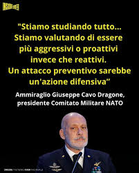 “La Nato anticomunista (fondata il 1949 a Washington), vuole fare un attacco militare “preventivo” contro la Russia usando come “alibi morali” gli attacchi all’Ucraina (la quale ha aderito ai piani militari della Nato nel 2021, dopo più di 50 anni di subordinazione alla Russia). La Nato è dal 1949 che cerca qualcuno (qualche disgraziato) che esegua (guardia armata – braccio armato) la loro guerra tra poteri forti militari e politici (destra e sinistra) contro la Russia. L’ammiraglio Dragone dichiara ancora: “Stiamo valutando di agire in modo più aggressivo e preventivo, piuttosto che reagire”. Ma che cosa significa? Secondo l’ammiraglio italiano, l’”attacco preventivo” può essere considerato come un’azione difensiva ma, aggiungiamo noi: dittatoriale, liberale, monarchica.