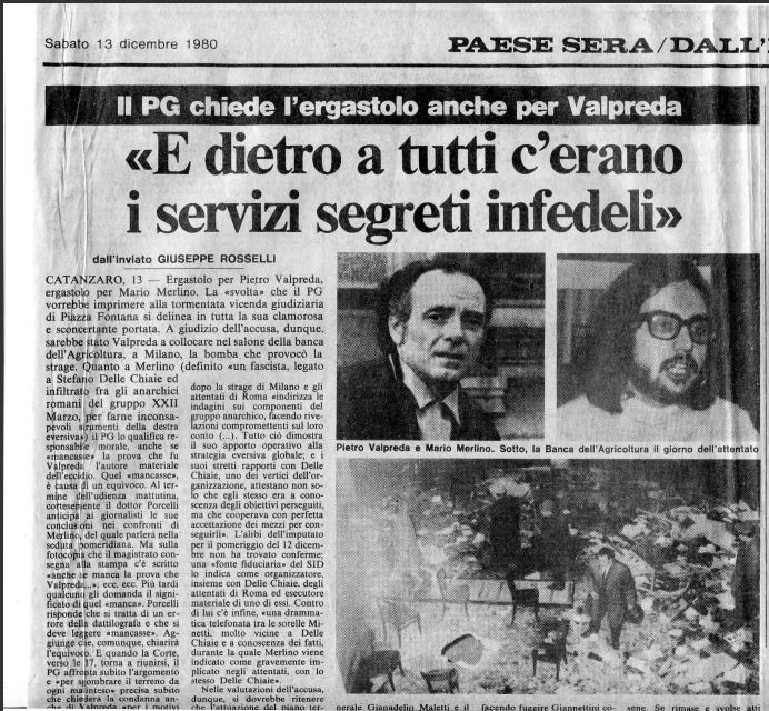 Il 12 dicembre è l’anniversario della strage di stato di piazza Fontana, un attentato fascista, compiuto nel 1969 a Milano, all’interno della sede della Banca Nazionale dell’Agricoltura che causò 17 morti e 88 feriti. Come strage terroristica è stata considerata l’inizio della strategia della tensione, un piano militare eseguito dai servizi segreti della Nato anticomunista, chiamato ‘patto Atlantico’, un’alleanza militare fondata il 4/4/1949 a Washington, per il potere e gli equilibri precostituiti dai politici (dal potere sia di destra che di sinistra), un piano militare organizzato e fatto eseguire dal politico cattofascista Tambroni, (monocolore DC con MSI) che rimette in gioco con quella manovra militare la destra politica dopo l’apertura a sinistra nel 1956. Piazza fontana fu uno dei 5 attentati, avvenuti in un lasso di tempo di 53 minuti, che colpirono contemporaneamente Roma e Milano.