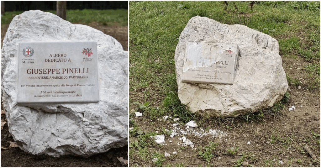 Ricordiamo che quelle merde dei fascisti comandati e pagati dai servizi segreti, hanno vandalizzato per la sesta volta la targa (foto sotto) in ricordo del compagno Anarchico Giuseppe Pinelli, ferroviere e attivista Anarchico morto il 15 dicembre 1969 ucciso da quei vili e vigliacchi sbirri col cervello piccolo, frustrati e limitati, gente che non pensa, e quindi senza sentimento, ucciderebbero anche la loro madre pur di portare avanti un ordine superiore, esaltano il “nonnismo” perché abituati come prassi a farselo anche tra di loro!