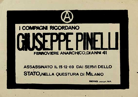 La strage di Piazza Fontana dove incolparono ingiustamente il compagno anarchico Giuseppe Pinelli, torturato e ucciso in questura a Milano tra il 15 e il 16 dicembre 1969. Il compagno anarchico Pino Pinelli, ferroviere, era stato buttato giù da una finestra del quarto piano della questura di Milano per nascondere le torture fisiche (oltre a quelle psicologiche), che gli sbirri gli fecero in quei giorni, perché Pinelli non voleva firmare la falsa dichiarazione di essere stato lui l’esecutore della strage di stato, e insisteva dichiarando che la strage fu una strage fatta dallo stato, non dagli anarchici e, siccome nonostante le torture non voleva accettare di firmare, gli sbirri infami lo lanciarono dalla finestra, inscenando un suicidio per nascondere l’omicidio di stato. La strategia della tensione è stata portata avanti dall’allora capo dello stato Saragat, che aveva ispirato la scissione del Partito socialista, da cui era rinato il Partito socialdemocratico, per forzare la crisi del centro sinistra in senso centrista ed autoritario. Passaggio obbligato di tale progetto sarebbe stato lo scioglimento anticipato delle Camere e nuove elezioni che, invece, vennero momentaneamente evitate dalla costituzione di un monocolore DC (destra e sinistra assieme) presieduto da Rumor (foto sotto).